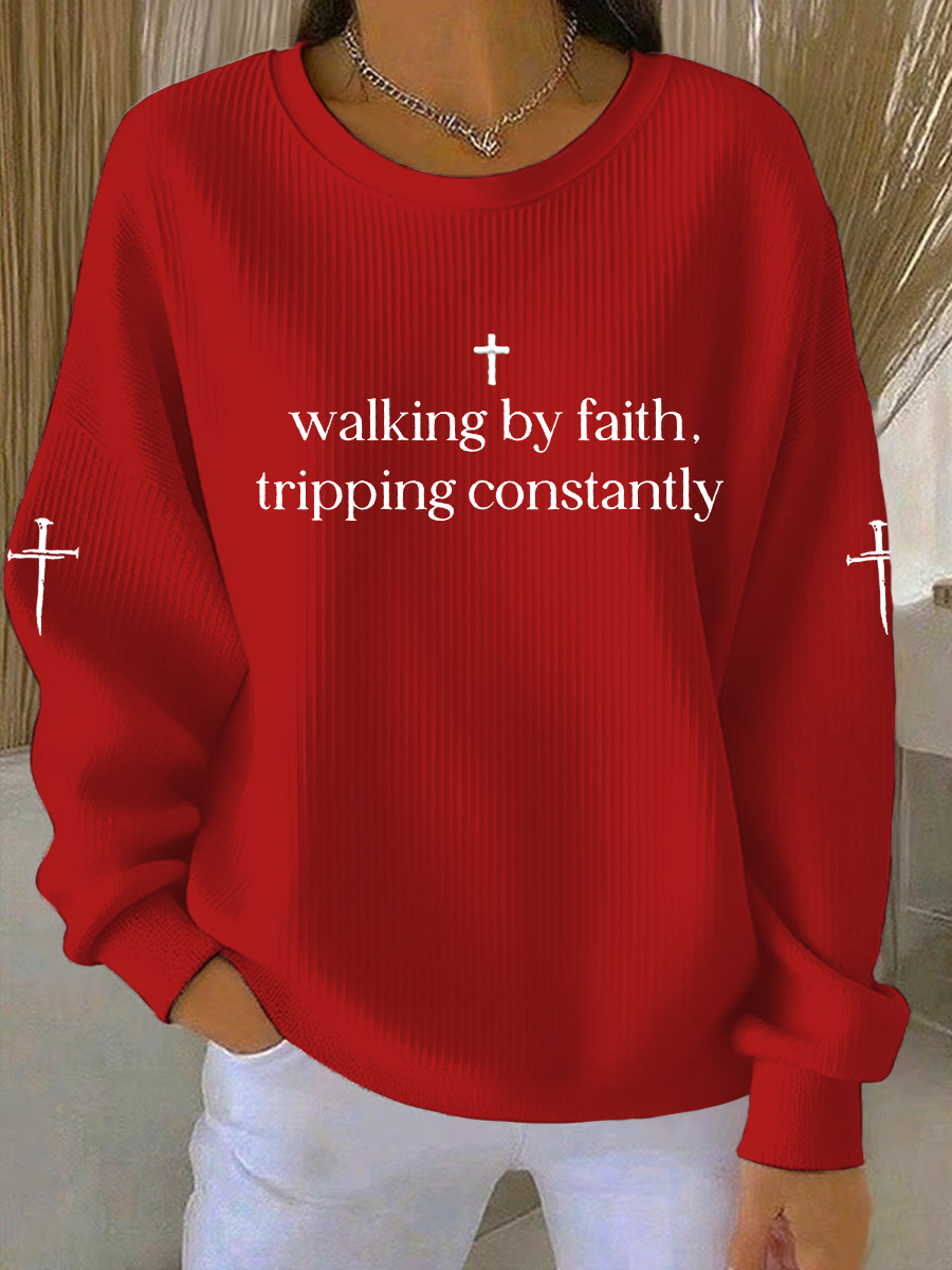 Women's Walking by Faith Tripping Constantly Cross Ribbed Round-Neck Sweatshirt