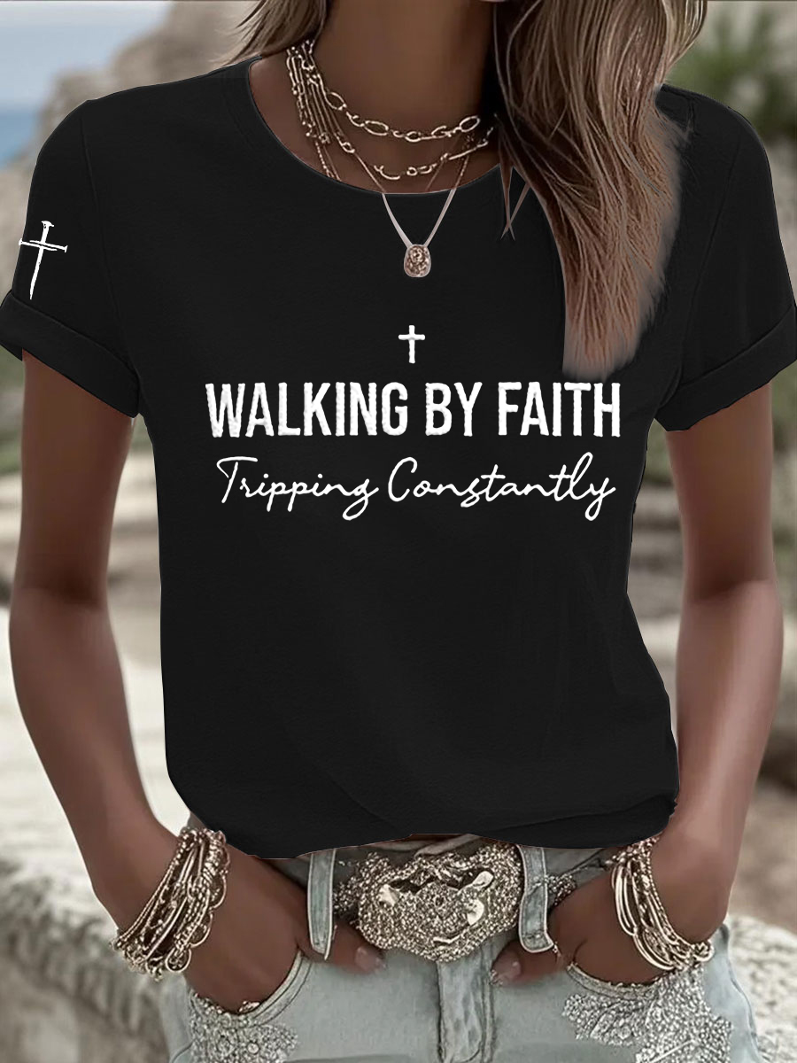 Women's Walking by Faith Tripping Constantly Cross Short Sleeve T-Shirt