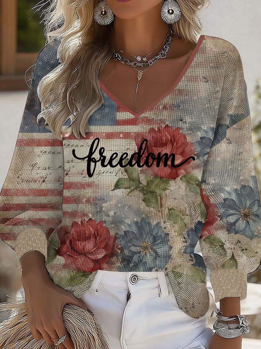 Women's Freedom Printed V-Neck Long Sleeve Shirt