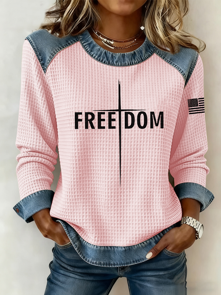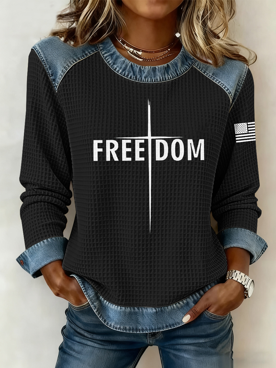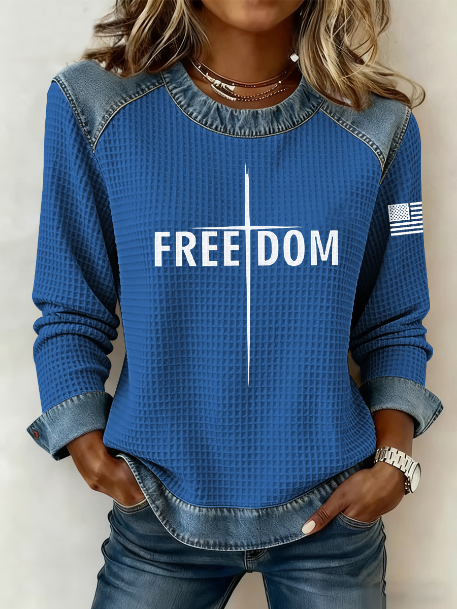 Women's Freedom God Family Country In That Order Printed Denim Patchwork Waffle Top