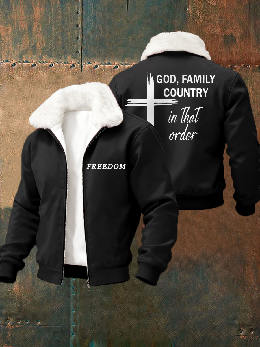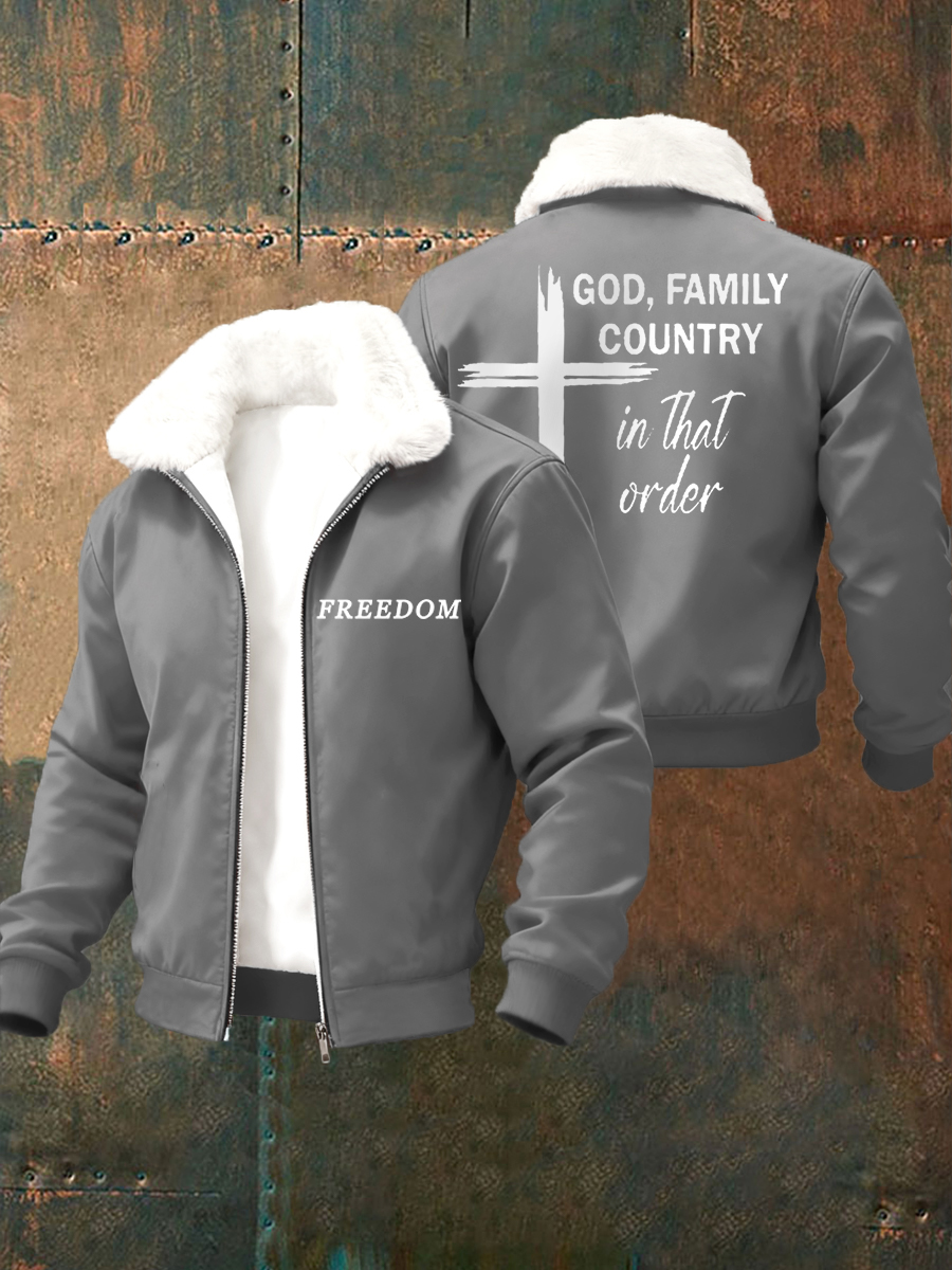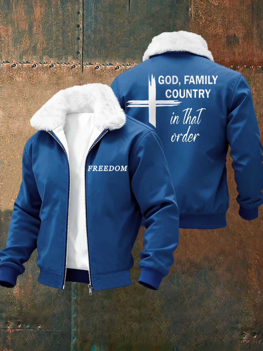Men's Freedom God Family Country In That Order Fur Collar Zip-Up Jacket