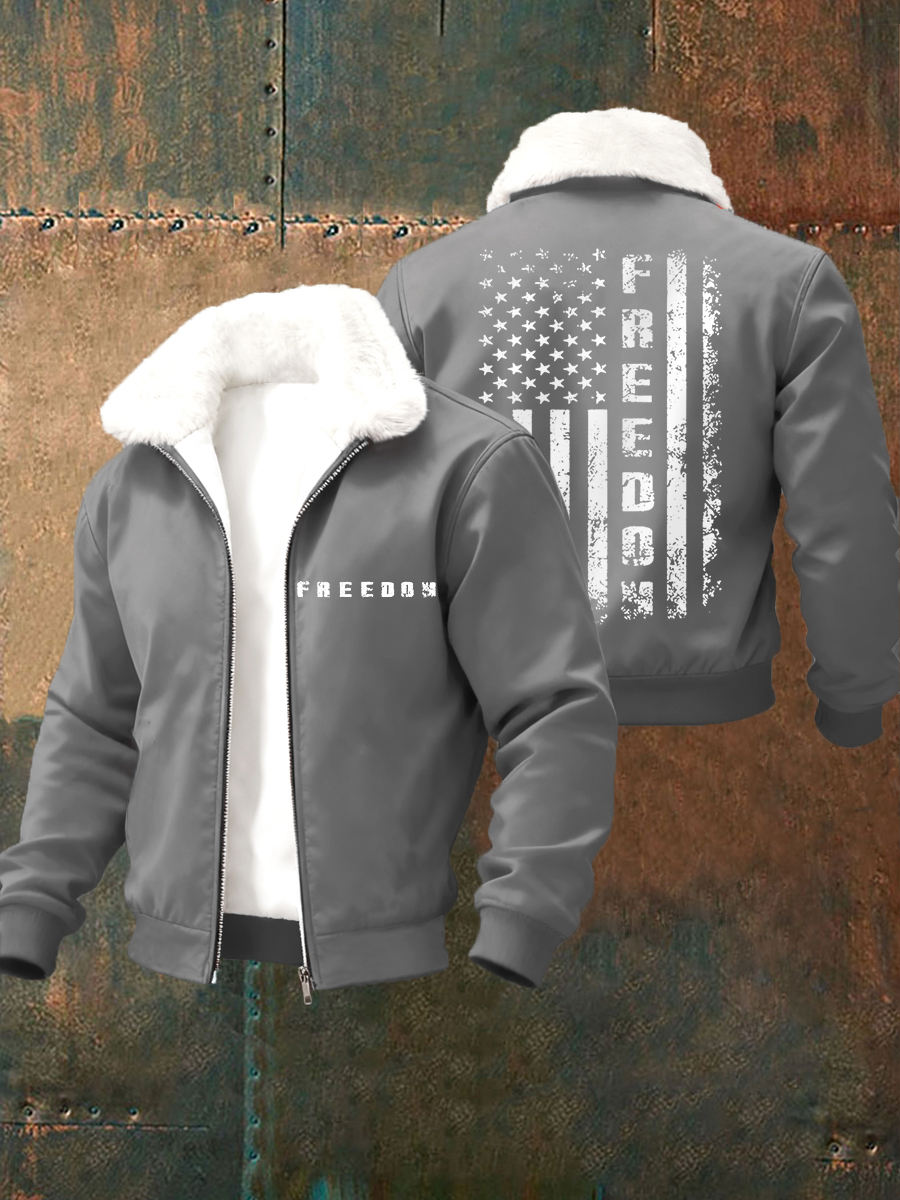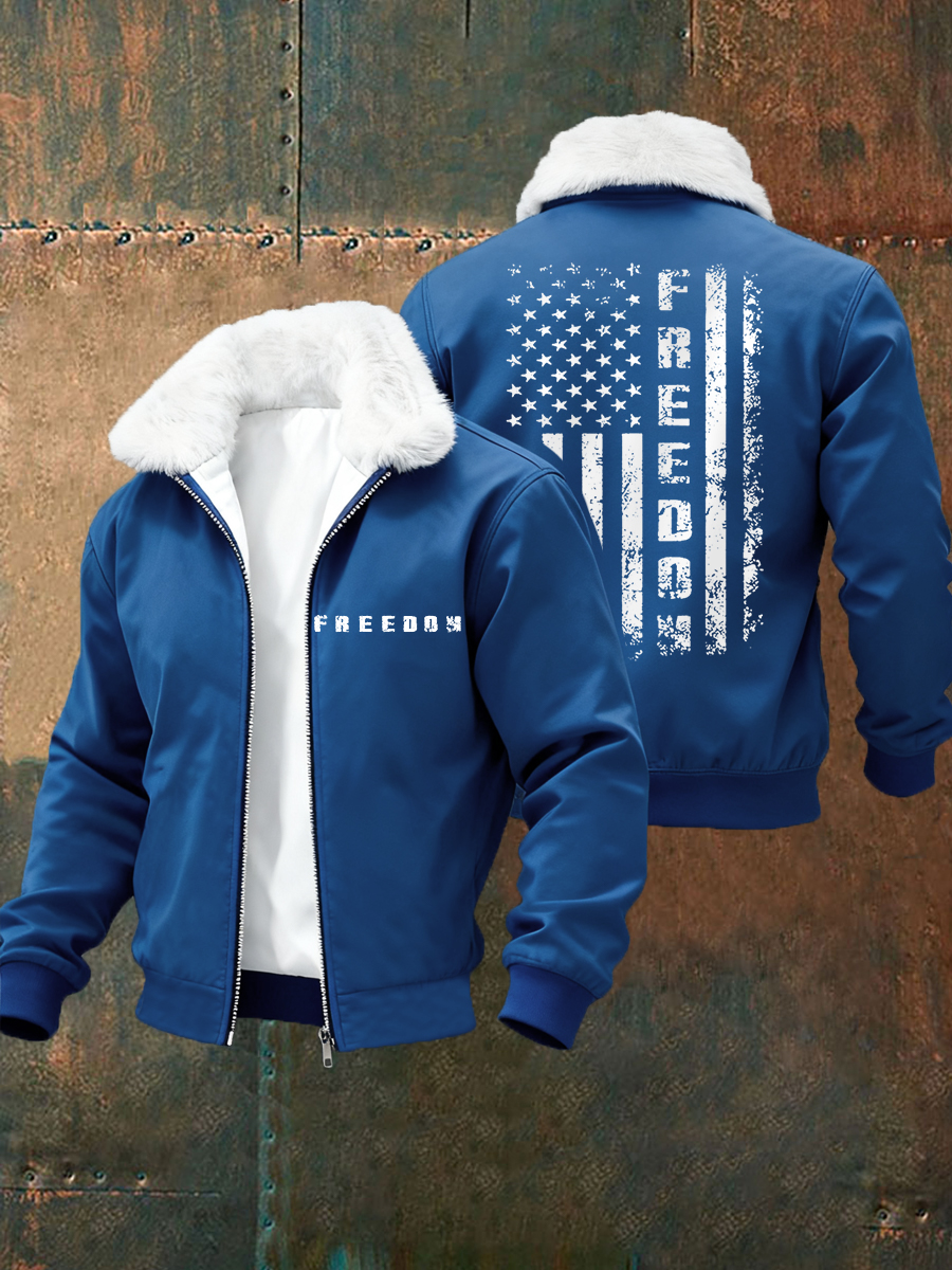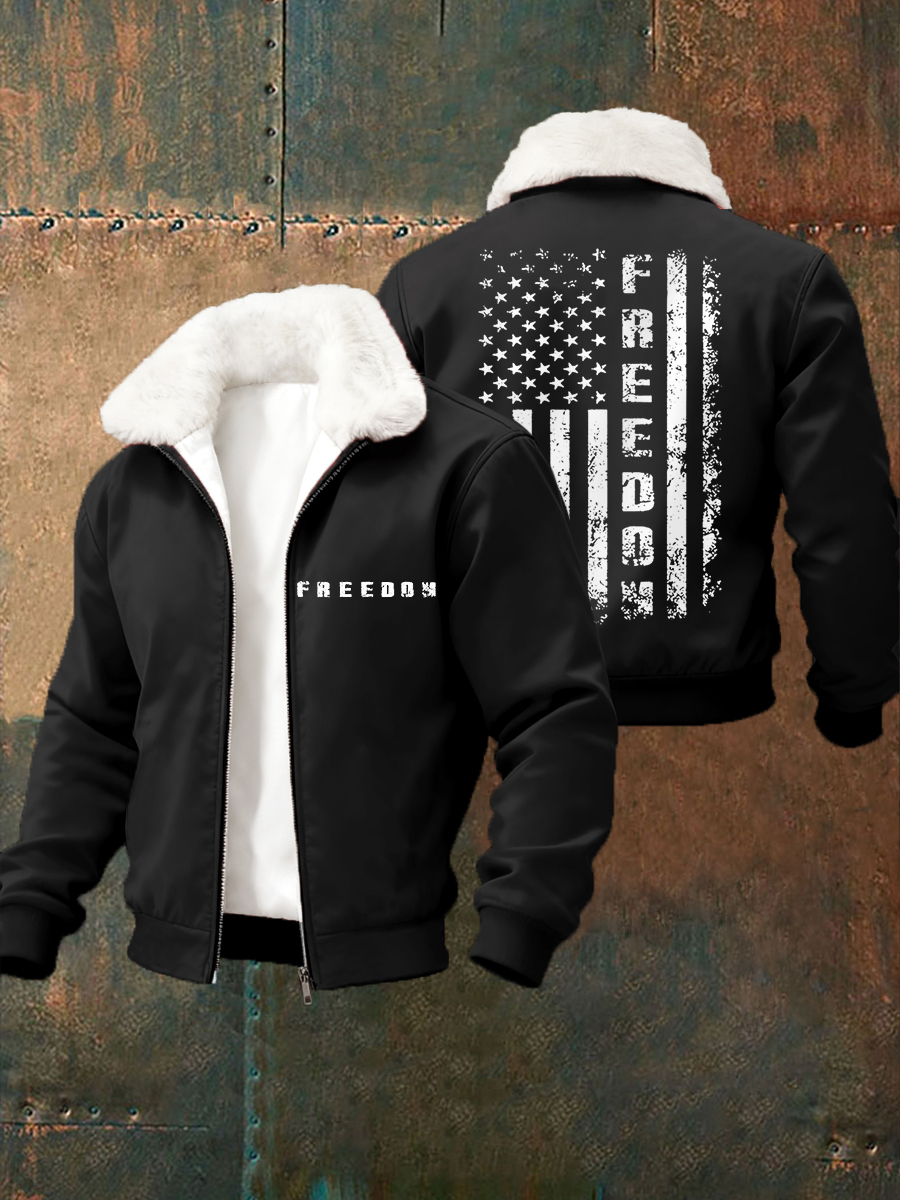 Men's Freedom Flag Print Fur Collar Zip-Up Jacket
