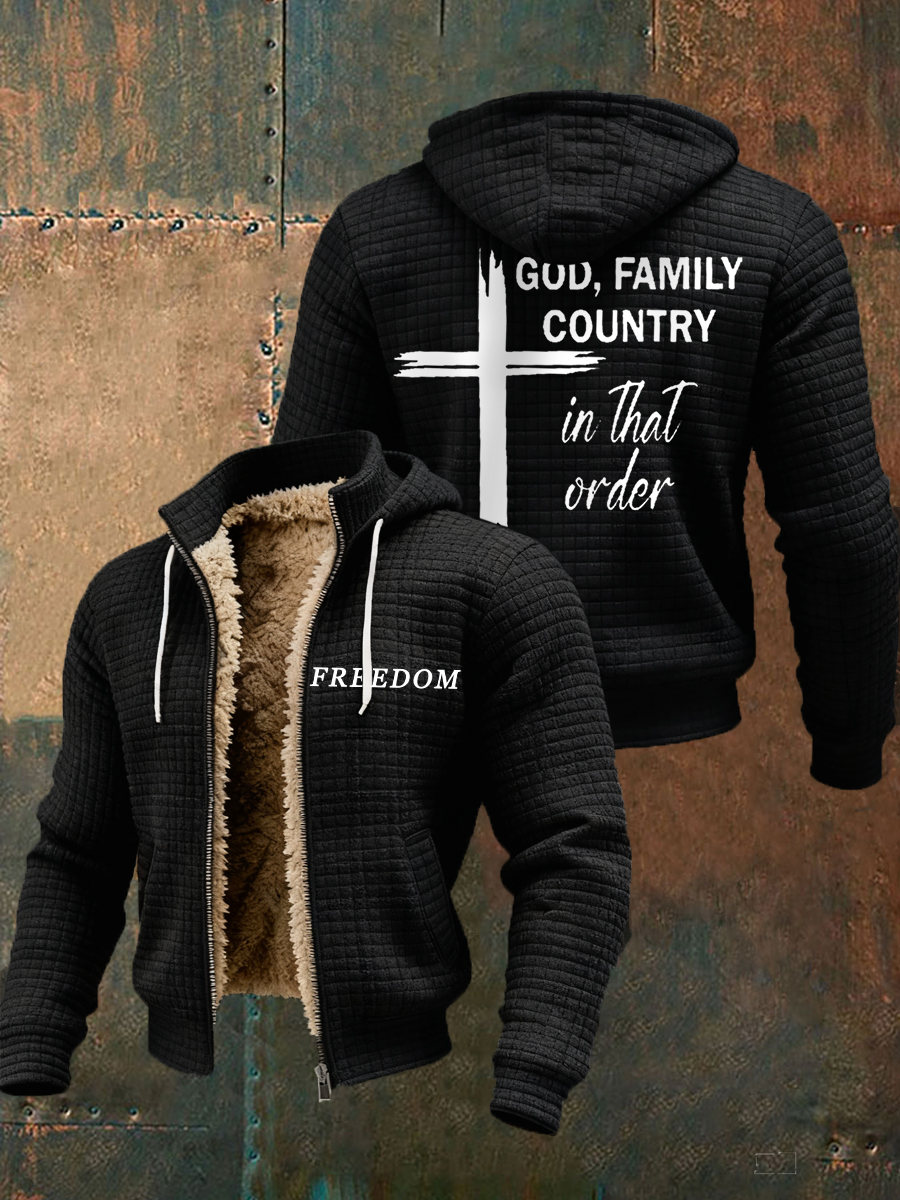Men's Freedom God Family Country In That Order Print Plush Zipper Hooded Jacket