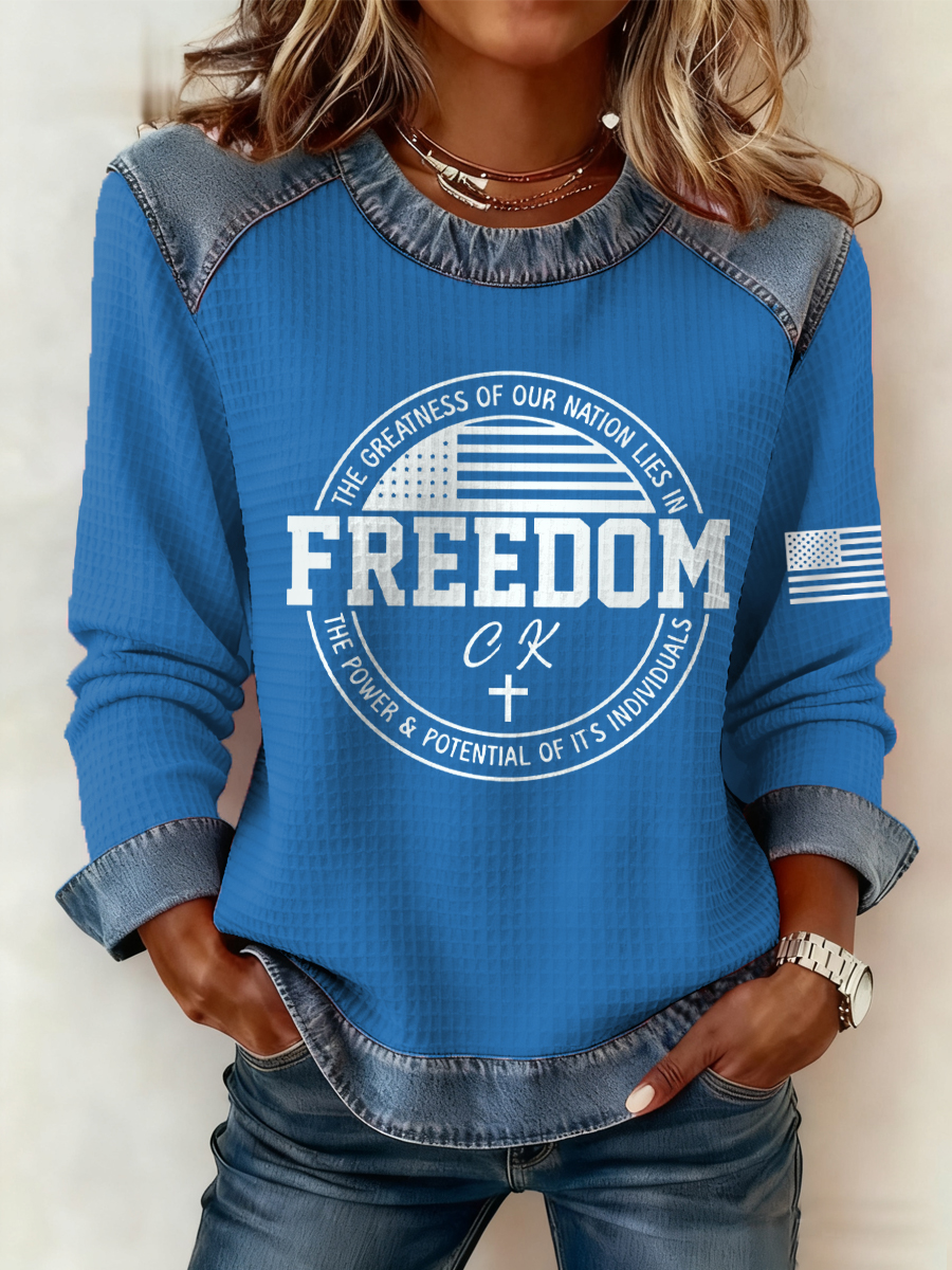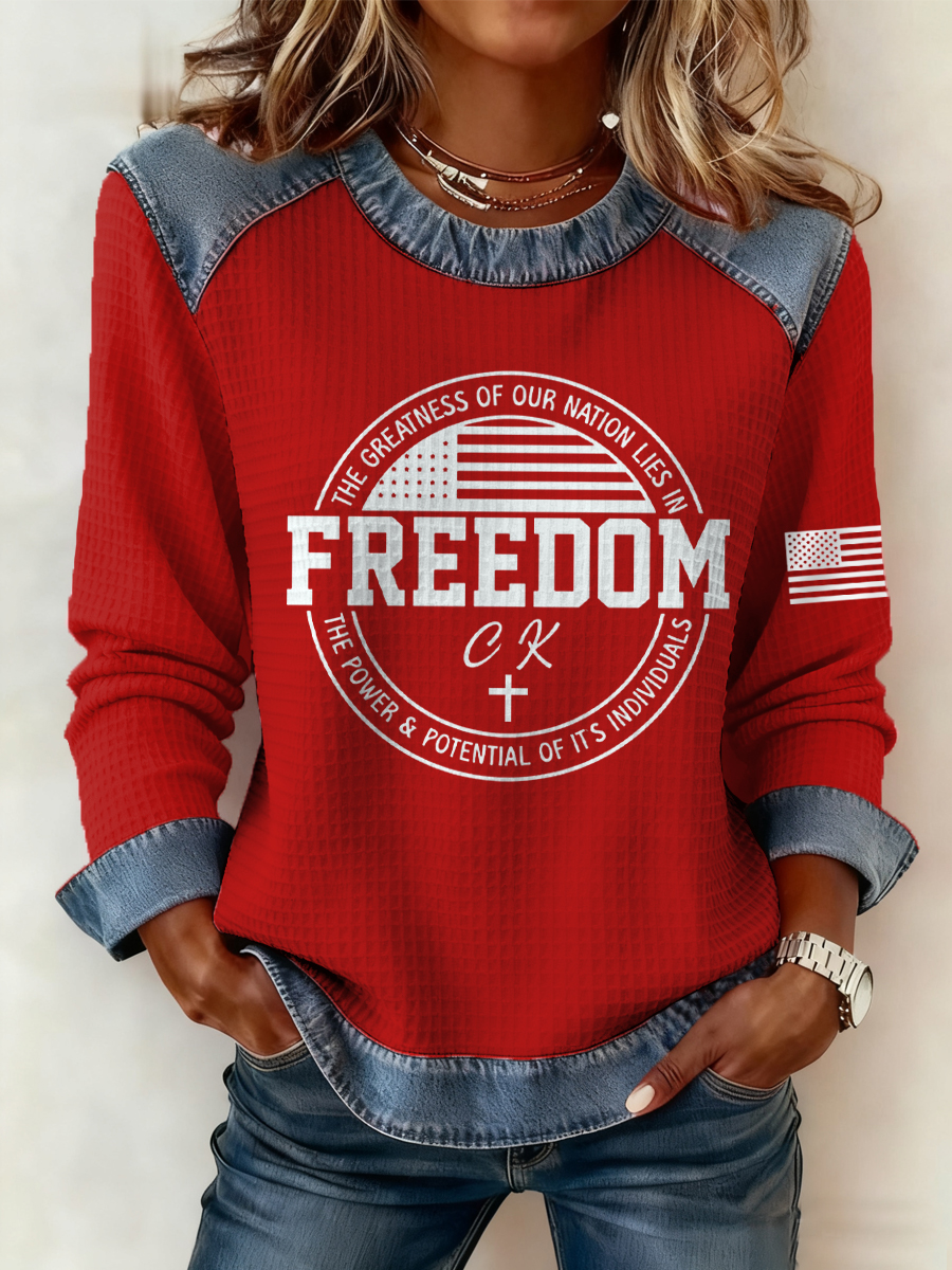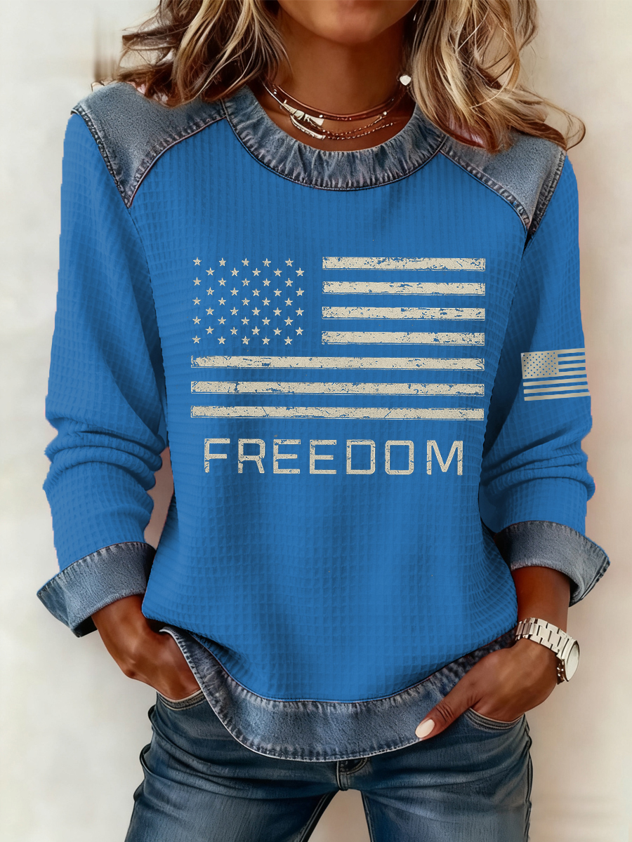 Women's Freedom 1776-2026Flag Printed Denim Patchwork Waffle Top